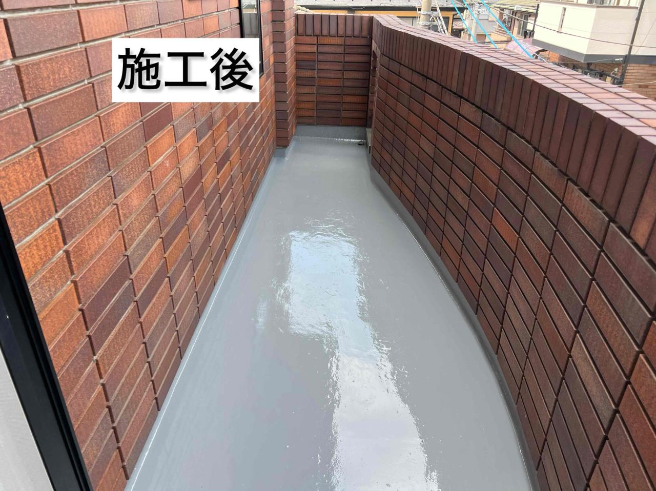 トップコートを塗り直すことで、防水層を紫外線や風雨から守り、耐久性を大幅に向上させます。仕上がりはツヤのある美しい表面になりました!